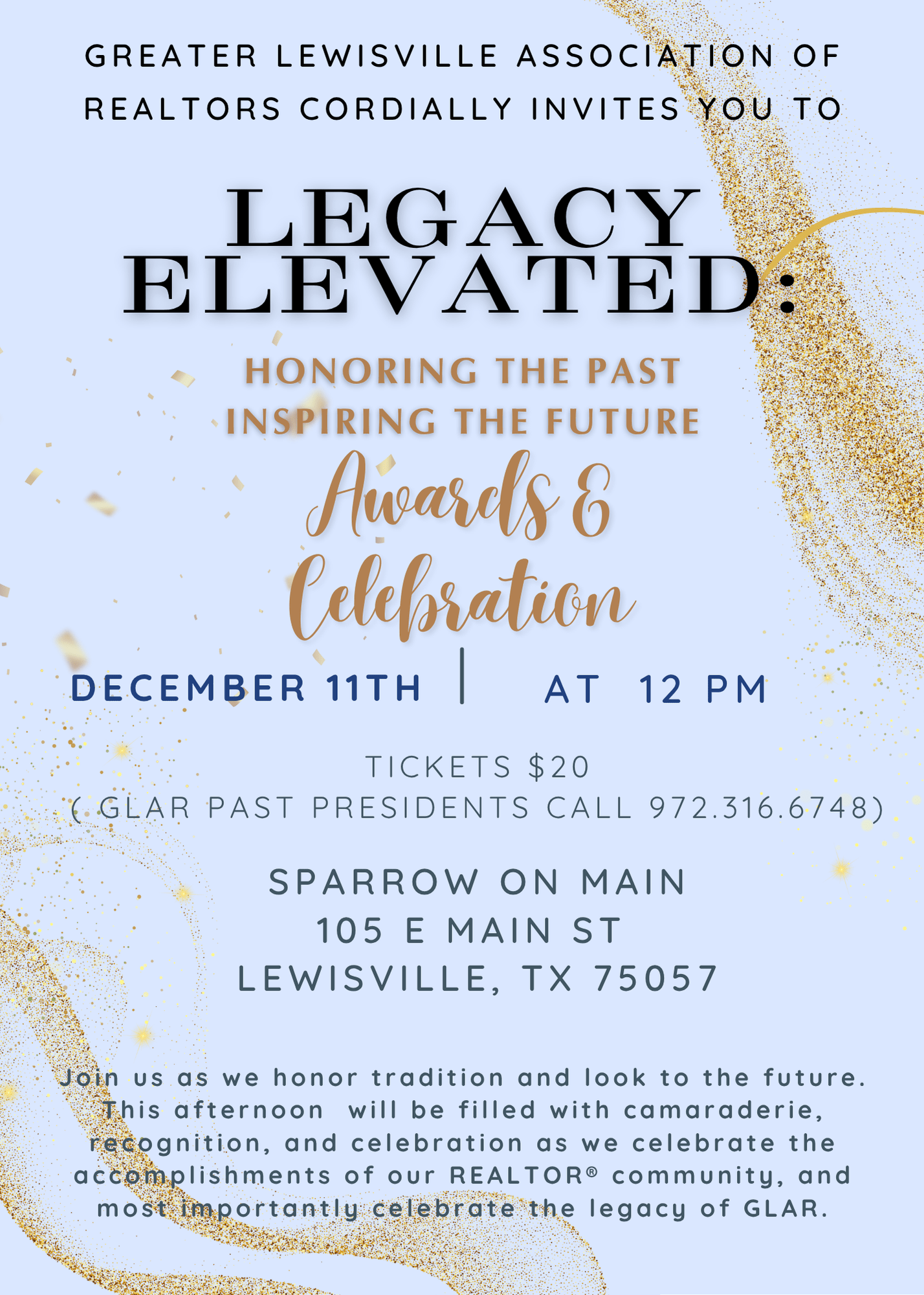 Join us as we honor tradition and look to the future. This elegant afternoon at the Sparrow On Main will be filled with camaraderie, recognition, and celebration as we welcome new leadership, celebrate the accomplishments of our REALTOR® community, and most importantly celebrate the legacy of GLAR.
