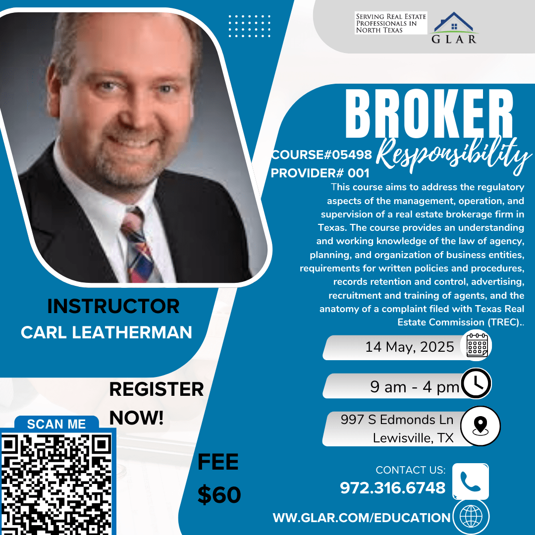 This course aims to address the regulatory aspects of the management, operation, and supervision of a real estate brokerage firm in Texas. The course provides an understanding and working knowledge of the law of agency, planning, and organization of business entities, requirements for written policies and procedures, records retention and control, advertising, recruitment and training of agents, and the anatomy of a complaint filed with Texas Real Estate Commission (TREC).