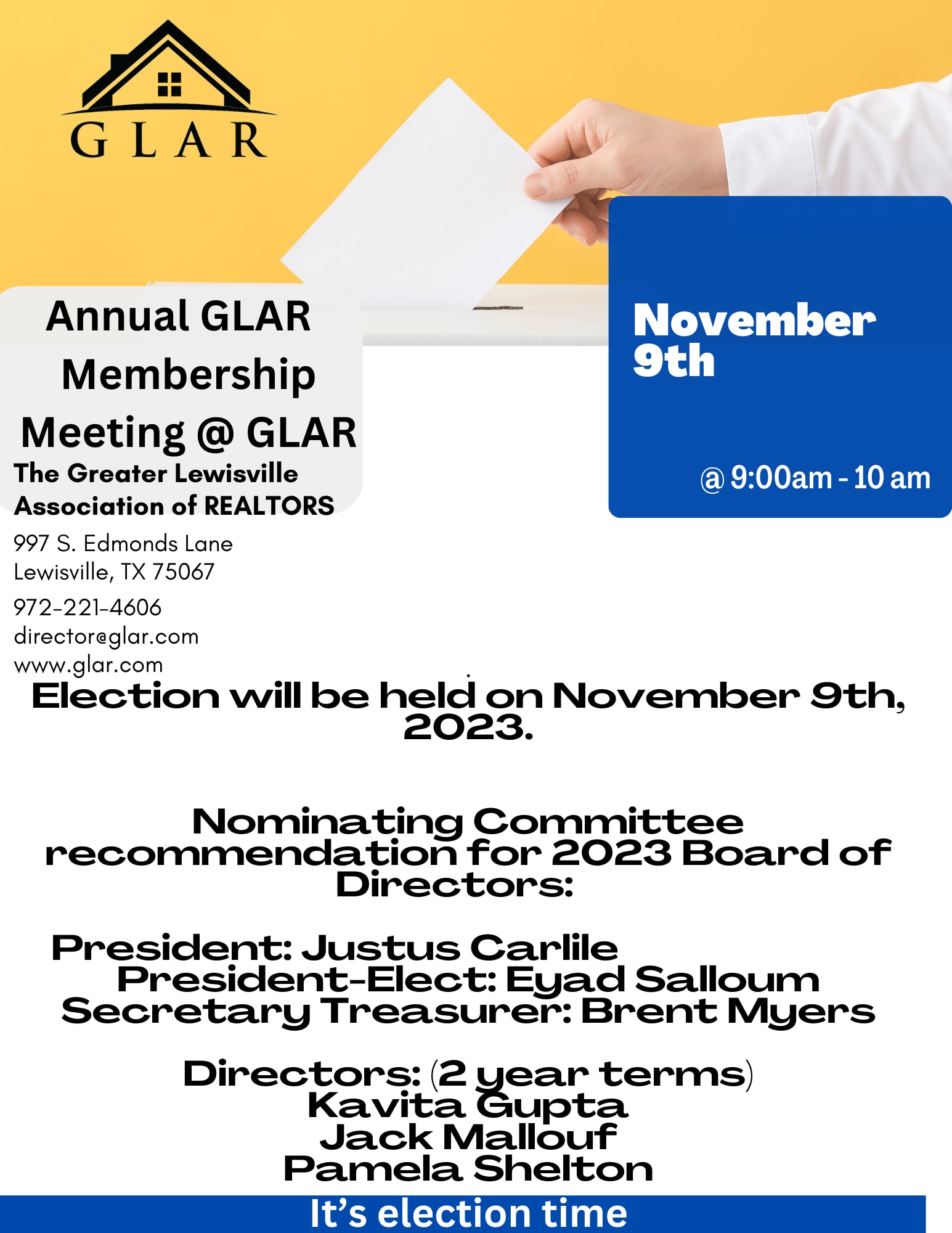 We look forward to seeing you on November 9th at 9:00am, at GLAR. Breakfast will be served.